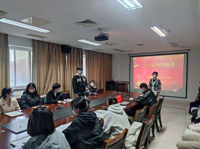 活动初始,党支部书记孙静公布了快问快答活动的比赛规则。由支部教师随机抽取题目,同学们举手抢答模式。
