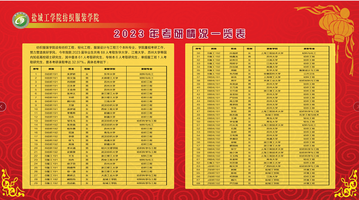 星光不负赶路人,时光不负考研人。在全体老师和同学们的共同努力下,2023年纺服学院共有68人考取东华大学、江南大学、苏州大学等国内知名高校硕士研究生,其中普本61人考取研究生,专转本6人考取研究生,单招服工班1人考取研究生,普本考研录取率达32.97%。我院2021年普本考研录取率为31.95%,2022年为35.23%,连续多年普本考研录取率稳定在30%以上。